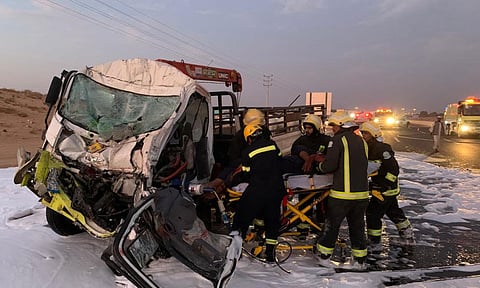 باشرت فرق الدفاع المدني بمحافظة عنيزة حالة تسرب بنزين على طريق القصيم- الرياض السريع، نتيجة اصطدام سيارة بصهريج، نتج عنه احتجاز ووفاة سائق السيارة.
