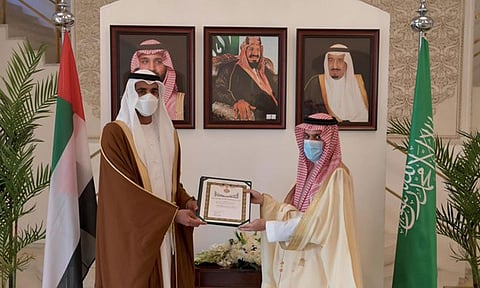 إنفاذًا لأمر خادم الحرمين الشريفين الملك سلمان بن عبدالعزيز آل سعود، سلّم الأمير فيصل بن فرحان بن عبدالله، وزير الخارجية سفير دولة الإمارات العربية المتحدة السابق لدى المملكة الشيخ شخبوط بن نهيان بن مبارك آل نهيان، وشاح الملك عبدالعزيز من الطبقة الثانية؛ نظير ما قام به من جهود في تعزيز العلاقات الثنائية والمتميزة بين البلدين الشقيقين في جميع المجالات.