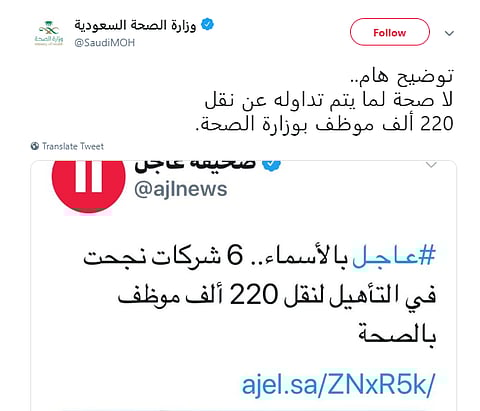 كشفت مصادر «عاجل» عن سبب مسارعة وزارة الصحة؛ لنفي خبر نشرته «عاجل»، أول من أمس الثلاثاء، حول تأهيل 6 شركات للمشاركة في المرحلة الأولى من خطة نقل الموظفين من المرافق الصحية الحكومية إلى مؤسسات جديدة، سيتم إطلاقها في إطار مشروع التحول الوطني، الذي تحمله « رؤية 2030».