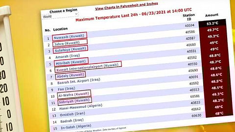 وسجَّلت منطقة «النويصيب» 53.2 درجة مئوية، كأعلى درجة حرارة في العالم، وتلتها الجهراء بتسجيل 49.7 ثم الصليبية 49.2 درجة مئوية.