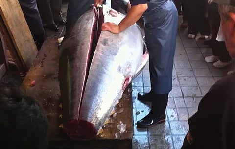 بيعت سمكة تونة بمبلغ قياسي بلغ 333.6 مليون ين ياباني (3.1 مليون دولار أمريكي) اليوم السبت، في أول مزاد يجرى هذا العام في سوق السمك الجديد بطوكيو.