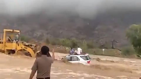 وأظهر المقطع شجاعة وبسالة مواطن، تدخل بسرعة بديهة مستعينًا بـ«شيول» لإنقاذ 3 أشخاص، كانت قوات الدفاع المدني وعدد من المواطنين يحاولون إنقاذهم من الاحتجاز جراء السيول، وانتشلهم من وسط المياه الجارية.