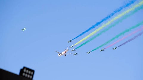 وقد أدت هذا الاستعراض طائرات من فريق «الصقور السعودية» من القوات الجوية الملكية السعودية، بمشاركة الخطوط الجوية السعودية؛ الحاملة للعلم السعودي.