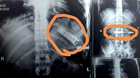 وأظهرت الفحوصات أن هذا الجسم الغريب هو هاتف جوال، فيما قال المريض إنّه ابتلعه خلال لحظة مزاح بينه وبين زملائه، لافتًا إلى أنه لم يبلغ أسرته بالواقعة ظنًا منه أنه وبمجرد أن يقوم بالقيء في أي وقت سيتمكن من إخراج الهاتف من معدته.