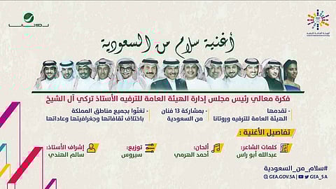 في تعاون فني ضخم بين الهيئة العامة للترفيه وشركة روتانا للصوتيات والمرئيات، أطلقت أمس السبت، أغنية «سلام من السعودية» بمشاركة مجموعة من أكبر وأهم المطربين السعوديين.