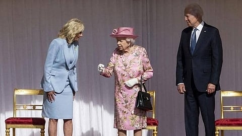 وحضرت الملكة مرتدية ثوبًا مزينًا بالورود وقبعة زهرية بصحبة جو بايدن وزوجته جيل عرضًا لحرس الشرف بزيهم الأحمر التقليدي معتمرين قبعة من شعر الدب الأسود في فناء القصر الذي تقيم فيه منذ بداية الوباء، وبعد أن استمعوا إلى عزف النشيدين الوطنيين البريطاني والأمريكي تحت أشعة الشمس، دخلوا لاحتساء الشاي قبل أن يغادر بايدن إلى بروكسل حيث من المقرر أن يشارك الاثنين في قمة الحلف الأطلسي.