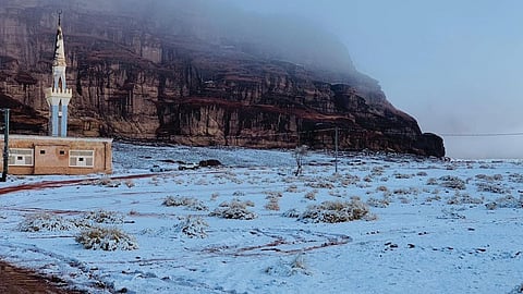 غطَّت الثلوج، أمس الجمعة، مرتفعات «نيوم» في منطقة تبوك شمال غرب السعودية، انعكاسًا لموجة قطبية شديدة البرودة تمر بها معظم أنحاء المملكة.