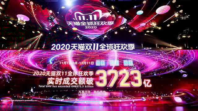 وخلال 30 دقيقة تقريبًا من بدء اليوم رسميًّا، أعلنت مجموعة علي بابا بيع بضائع بقيمة 372.3 مليار يوان (56.4 مليار دولار).