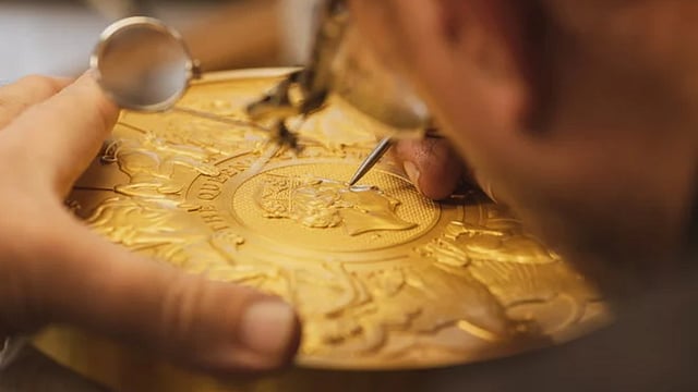 وأضافت الصحيفة، أنه تم سك العملة التي يبلغ عرضها 20 سم من قبل فريق من الحرفيين الرئيسيين، الذين يجمعون بين المهارات التقليدية والتكنولوجيا المبتكرة، حيث تم استخدام التقنيات الحديثة في بداية العملية من خلال آلات النقش لقطع التصميم بعناية على العملة التي جرى تصنيفها فئة عشرة آلاف جنيه إسترليني.