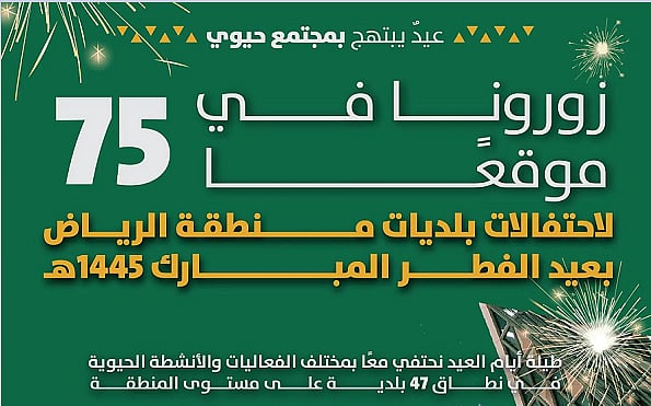 أكملت أمانة منطقة الرياض استعداداتها لمشاركة سكان المنطقة الاحتفال بعيد الفطر المبارك في نطاق بلدياتها، وأتمت تجهيز 76 موقعاً لاستقبالهم خلال أيام العيد.