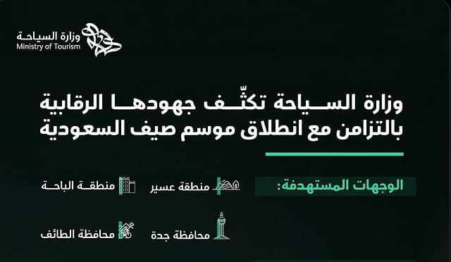 تزامنًا مع انطلاق موسم صيف السعودية، كثّفت وزارة السياحة جهودها الرقابية في عدد من الوجهات السياحية الصيفية بمختلف مناطق ومدن المملكة، لضمان التزام مرافق الضيافة -بمختلف أنواعها- بالحصول على الترخيص اللازم من وزارة السياحة، والتأكد من جودة الخدمات المقدمة للسياح والزوار من داخل المملكة وخارجها.