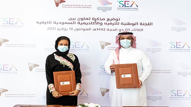 وقع رئيس اللجنة الوطنية للترفيه باتحاد الغرف السعودية الوليد البلطان والرئيس التنفيذي للأكاديمية السعودية للترفيه نوال الشريف، اليوم الثلاثاء، اتفاقية تعاون في مجال تدريب وتأهيل الكوادر الوطنية للعمل في قطاع الترفيه بالمملكة.