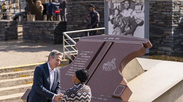 واستهل بلينكن زيارته إلى جنوب أفريقيا بزيارة للنصب التذكاري لهيكتور بيترسون في بلدة سويتو، على مشارف العاصمة جوهانسبرج، والذي يحيي ذكرى طالبًا قُتل في العام 1976 أثناء احتجاجه على نظام الفصل العنصري في البلاد، الذي انتهى في العام 1994.