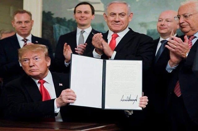 يذكر أن الرئيس الأمريكي دونالد ترامب، وقع مساء أمس الاثنين، على إعلان اعتراف واشنطن بسيادة إسرائيل على الجولان السوري المحتل، قائلًا عقب لقائه رئيس مجلس الوزراء الإسرائيلي بنيامين نتنياهو: «إن لدى إسرائيل الحق المطلق في الدفاع عن نفسها»، وأضاف: «أي اتفاق مُحتمَل بخصوص الشرق الأوسط، لا بد أن يشمل حق إسرائيل في الدفاع عن نفسها».
