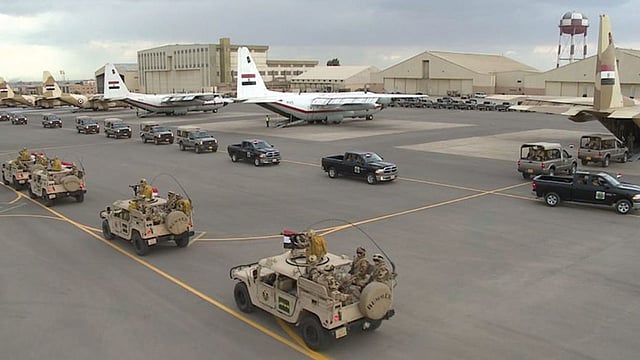 وذكر أن القوات الجوية نفذت عددًا من طلعات الاستطلاع وتقديم المعاونة النيرانية للعناصر المشاركة في تنسيق تام مع قوات الدفاع الجوي ومعاونة القوات البحرية، أثناء تنفيذ مهامها لتأمين المصالح الاقتصادية في مسرحي عمليات البحرين الأحمر والمتوسط.