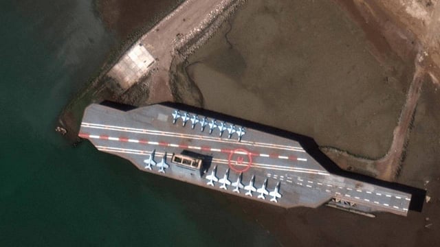 وأظهرت اللقطات نموذجًا لحاملة الطائرات الأمريكية من فئة «نيميتز» بوجود صفوف من مجسمات طائرات مقاتلة على جانبي مدرج الهبوط، وأطلق صاروخ آخر من مروحية خلّف دخانًا قبل أن يصطدم على ما يبدو بطرف السفينة الحربية الزائفة.