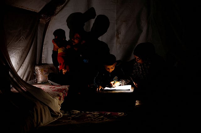 منذ اندلاع الحرب قبل أكثر من عامين، تعيش السيدة الفلسطينية مع زوجها وأطفالها الثلاثة من دون كهرباء. وكانت تعتمد على الشموع عندما نزحوا في البداية إلى مدينة رفح بجنوب القطاع، لكنها تخلّت لاحقاً حتى عن الشموع خوفاً من خطر اندلاع حريق في خيمتهم.
