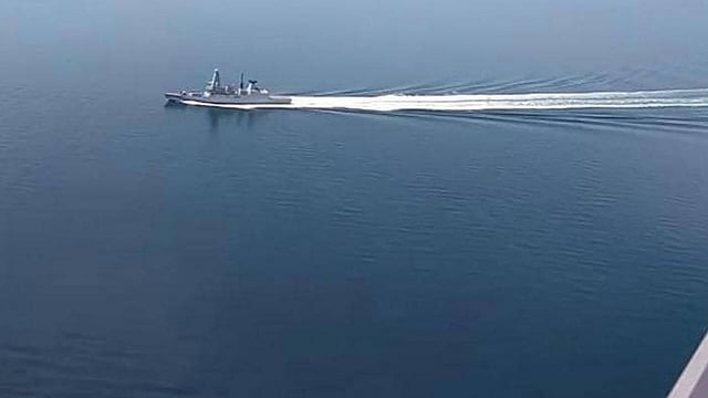 ويظهر الجزء الأول من اللقطات، الذي يبدو أن طائرة مسيرة قد التقطته، سفينة حربية روسية أثناء اقترابها من المدمرة البريطانية، وفي الجزء الثاني من الفيديو، الذي صورته طائرة مقاتلة، كانت مقاتلات روسية تحلق فوق السفينة البريطانية.