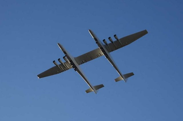 وتمتلك الطائرة مزدوجة الجسم التي صنعتها شركة ستراتولونش وتصل المسافة بين طرفي جناحيها 117 مترًا، أكبر من طول ملعب كرة قدم أمريكي، وحلقت لمدة ساعتين ونصف فوق صحراء موهافي بكاليفورنيا.
