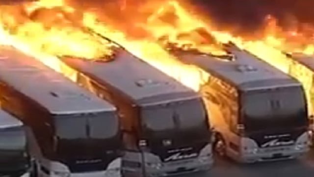 وأشارت الشبكة إلى أن "الحريق انتشر بسرعة في عديد من المحلات ودمر صفًّا من الحافلات المتوقفة في مكان قريب، ما أدى إلى تصاعد أعمدة كثيفة من الدخان".