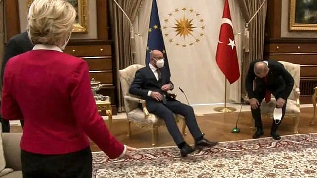 وأُجلست رئيسة المفوضية الأوروبية يومها على أريكة، بعيدًا عن رئيس المجلس الأوروبي شارل ميشال والرئيس التركي اللذين جلسا على مقعدين كانا الوحيدين المتوفرين. ووصفت الصحافة الأوروبية الحادث بـ«فضيحة الكنبة».