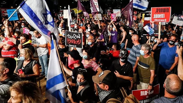 واندلعت المظاهرات «الحاشدة» التي طالب المحتجون خلالها باستقالة رئيس الوزراء الإسرائيلي؛ عازين مطالبهم إلى توغُّل قضايا الفساد وسوء إدارة نتنياهو للأزمة الاقتصادية والصحية في أعقاب انتشار فيروس كورونا المستجد «كوفيد – 19». وفق قناة «الشرق للأخبار».