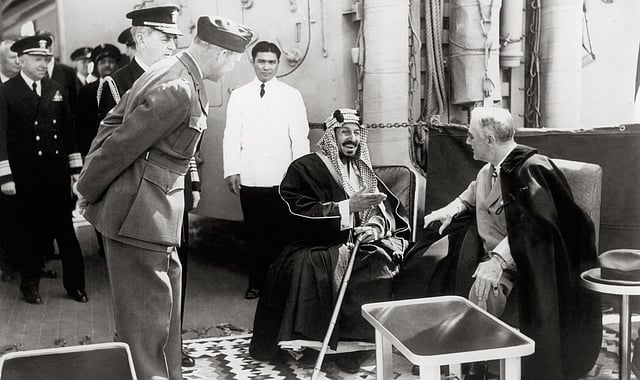 تمتد العلاقات السعودية الأمريكية على الصعيد السياسي إلى 77 عامًا مضت، وتأسست باللقاء التاريخي بين الملك عبدالعزيز بن عبدالرحمن آل سعود -يرحمه الله- والرئيس الأمريكي الأسبق فرانكلين روزفلت في فبراير عام 1945، وذلك بعد عام واحد من افتتاح السفارة الأمريكية في جدة عام 1944.