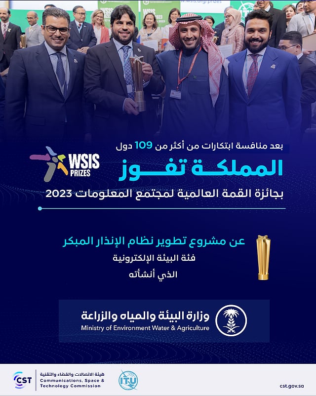 وحققت المملكة الفوز بالجائزة عن مشروع تطوير نظام الإنذار المبكر المقدم من وزارة البيئة والمياه والزراعة، حيث يقوم النظام الإلكتروني بتحليل خارطة المملكة من خلال المؤشرات الحيوية في البوابة الجيومكانية.