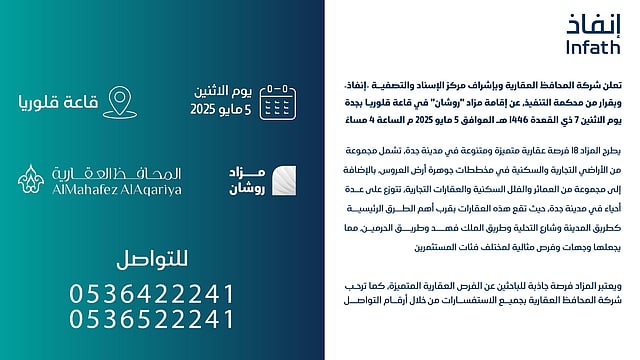 وأكدت شركة المحافظ العقارية أن مزاد «روشان» يمثل فرصة مثالية للراغبين في اقتناص عقارات بمواقع متميزة، داعية الراغبين إلى التواصل والاستفسار عبر الأرقام التالية: 0536422241 - 0536522241.