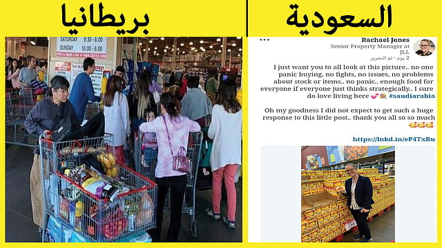 وعبر «تويتر» نشرت الفتاة «راشيل جونز» صورة لأحد الأسواق التجارية بالمملكة، وكتبت عليها: أريدك فقط أن تنظر إلى هذه الصورة.. لا أحد يقوم بالشراء بدافع الهلع، ليس هناك قتال، ولا نقص في الطعام.
