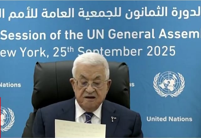 ألقى الرئيس الفلسطيني محمود عباس كلمة عبر الفيديو أمام الجمعية العامة للأمم المتحدة، أشاد خلالها بدور المملكة العربية وفرنسا وفرنسا في رئاسة مؤتمر حل الدولتين، وبالدول التي تساند الجهود الرامية إلى وقف ما وصفه بـ«الإبادة الجماعية» بحق الشعب الفلسطيني، مؤكدًا أن العالم يقف أمام مسؤولية تاريخية تجاه القضية الفلسطينية.