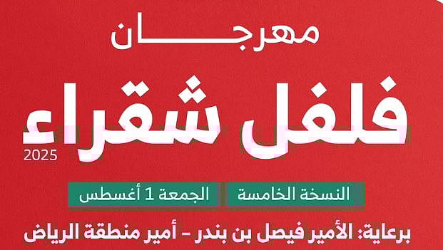 برعاية الأمير فيصل بن بندر بن عبد العزيز، أمير منطقة الرياض، تنطلق الجمعة المقبلة 1 / 8 / 2025م، فعاليات مهرجان "فلفل شقراء 5"، ببرامج متنوعة ثقافية وتسويقية وترفيهية واجتماعية، تستهدف جميع فئات المجتمع.