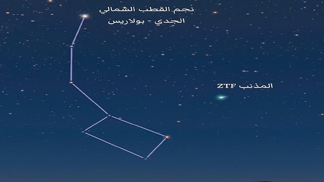وأوضحت فلكية جدة –عبر تويتر- أنه يمكن رصد المذنب بالقرب من نجوم الدب الأصغر في الأفق الشمالي، ويفضل استخدام المنظار أو تلسكوب صغير.