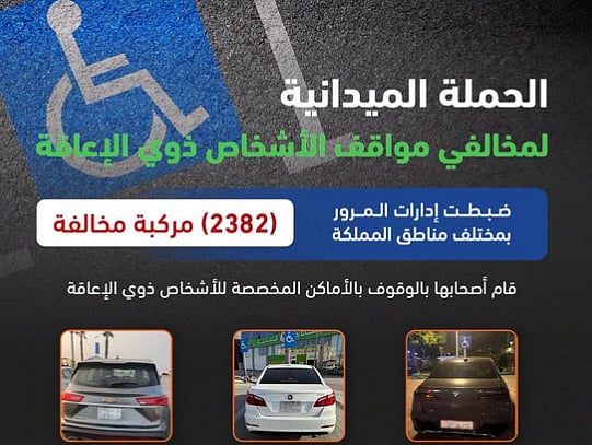 أعلنت الإدارة العامة للمرور، ضبط 2382، مركبة مخالفة متوقفة في الأماكن المخصصة للأشخاص ذوي الإعاقة، وذلك في جميع مناطق المملكة.