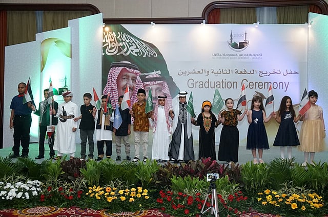 احتفلت أكاديمية الحرمين السعودية في جاكرتا، مساء أمس الجمعة، بتخريج الدفعة الثانية والعشرين من طلاب وطالبات الأكاديمية، برعاية سفير خادم الحرمين الشريفين في جمهورية إندونيسيا عصام عابد الثقفي، وحضور عددٍ من السفراء العرب، ومديري المكاتب، وأعضاء البعثة السعودية في جاكرتا، وجمعٍ من المعلمين والطلاب وأولياء أمورهم، وبعض المدعوين من الأكاديميين، والمثقفين، والمهتمين بالعلم.