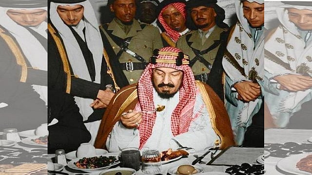 وأرفق "الحساب" الصورة بتعليق: "الملك عبدالعزيز في صورة جميلة تم التقاطها خلال مأدبة العشاء التي أقامها للجنرال الأمريكي رالف رويس والوفد المرافق معه."