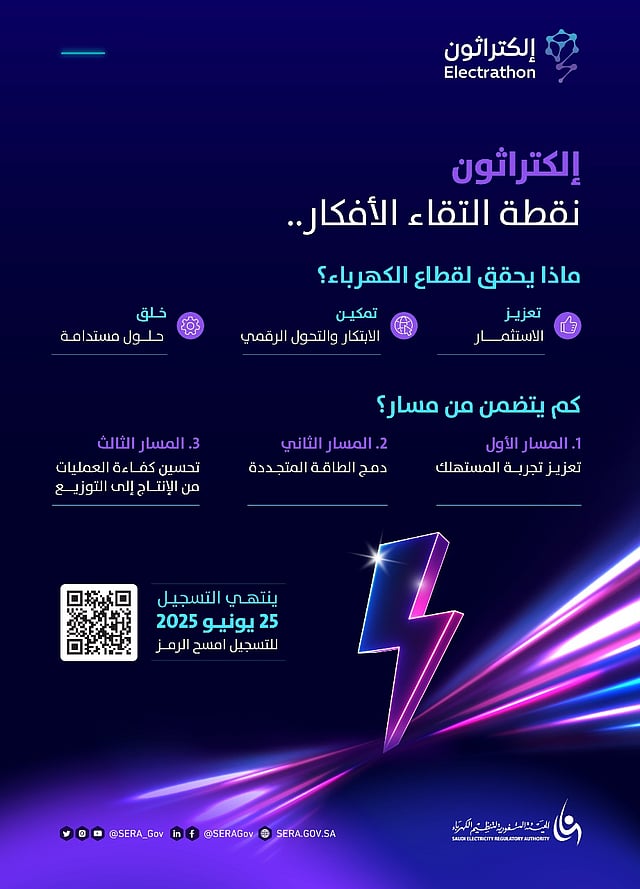 ودعت الهيئة السعودية لتنظيم الكهرباء المبدعين والمبتكرين والمهتمين إلى التقدم والتسجيل عبر زيارة الموقع الإلكتروني للإلكتراثون، مشيرةً إلى أن آخر موعد للتسجيل هو 25 يونيو 2025