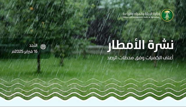 ووفقًا للتقرير اليومي لوزارة البيئة والمياه والزراعة حول كميات هطول الأمطار في مناطق المملكة كافة؛ سجّلت (142) محطة رصد هيدرولوجي ومناخي، خلال الفترة من الساعة التاسعة صباح السبت 15 فبراير وحتى التاسعة صباح الأحد 16 فبراير 2025م؛ هطول أمطارٍ في مناطق (الرياض، مكة المكرمة، المدينة المنورة، القصيم، الشرقية، عسير، حائل، الحدود الشمالية، الجوف).