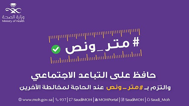 دشنت وزارة الصحة، اليوم الأربعاء، حملة توعوية جديدة تحت شعار «متر ونص»؛ تهدف إلى تعزيز التباعد الاجتماعي داخل وخارج المنزل بمسافة متر ونص بين كل شخص وآخر والالتزام بترك مسافة متر ونصف المتر عند الحاجة إلى مخالطة الآخرين بهدف تعزيز الوقاية من فيروس كورونا الجديد كوفيد 19 والحد من انتشاره، تواصلًا لجهود الصحة التوعوية واستمرارًا لسلسلة رسائلها التوعوية التي تبثها عبر مختلف المنصات الإعلامية.