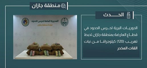 أعلنت الدوريات البرية لحرس الحدود في قطاع العارضة بمنطقة جازان، إحباط تهريب (120) كيلوجرامًا من نبات القات المخدر.