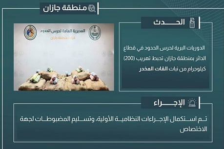 أعلنت الدوريات البرية لحرس الحدود في قطاع الدائر بمنطقة جازان إحباط تهريب (200) كيلوجرام من نبات القات المخدر، وجرى استكمال الإجراءات النظامية الأولية.