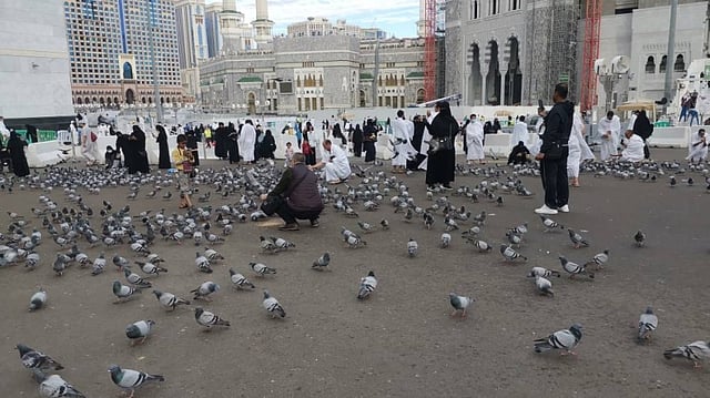 يحرص ضيوف الرحمن، من الحجاج والمعتمرين، على إطعام الحمام في ساحات الحرم المكي.