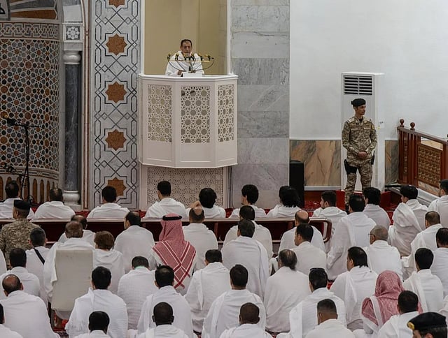 جاء ذلك في خطبة عرفة التي ألقاها فضيلته اليوم بمسجد نمرة، وتقدم المصلين فيها الأمير سعود بن مشعل بن عبدالعزيز نائب أمير منطقة مكة المكرمة نائب رئيس لجنة الحج المركزية، ومفتي عام المملكة رئيس هيئة كبار العلماء الرئيس العام للبحوث العلمية والإفتاء الشيخ عبدالعزيز بن عبدالله بن محمد آل الشيخ، ووزير الشؤون الإسلامية والدعوة والإرشاد الشيخ الدكتور عبداللطيف بن عبدالعزيز آل الشيخ، ووزير الحج والعمرة الدكتور توفيق بن فوزان الربيعة، وفيما يلي نصها: