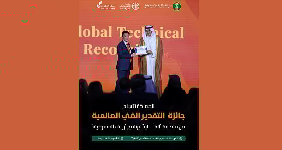 تسلّمت المملكة العربية السعودية اليوم، جائزة التقدير الفني العالمية لمنظمة الأغذية والزراعة للأمم المتحدة "الفاو"، تحت فئة (المشاريع الرائدة في التعاون بين بلدان الجنوب والتعاون الثلاثي)، التي حصل عليها برنامج التنمية الريفية الزراعية المستدامة "ريف السعودية"، أكبر برنامج تنموي زراعي على مستوى العالم، وذلك لتميزه في تطبيق أفضل الممارسات والمبادرات المبتكرة في تعزيز الأمن الغذائي وحول نظم الأغذية الزراعية.