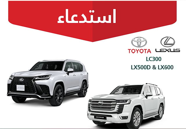 أعلنت وزارة التجارة عن استدعاء 19,281 مركبة من طرازات تويوتا «LC300» ولكزس «LX600 / LX500D»، موديلات 2022 – 2024، وذلك بسبب خلل فني قد يؤثر في سلامة المركبات أثناء القيادة.