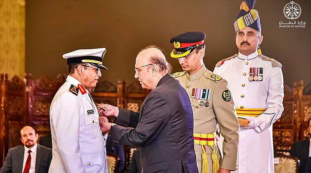 وقلّد فخامته معالي رئيس أركان القوات البحرية الوسام، خلال استقباله له اليوم والوفد المرافق في القصر الرئاسي بالعاصمة إسلام آباد.