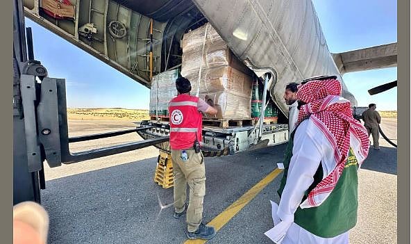 يأتي ذلك بالتنسيق مع وزارة الدفاع، فيما تحمل الطائرة الإغاثية على متنها مواد غذائية وإيوائية.