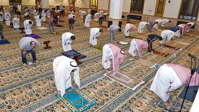 وأظهرت صور لحظات دخول المصلين، ومراعاتهم التباعد بمقدار مترين ووضع المسافة الكافية بين الصفوف، ورفع المصاحف مؤقتًا.