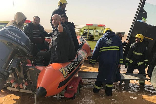 تمكنت فرق الدفاع المدني بتبوك، اليوم الأربعاء، من إنقاذ 15 راكبًا كانوا على متن حافلة محتجزة في تجمُّع مياه بأحد الطرق التابعة لمحافظة تيماء.