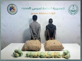 قبضت الدوريات البرية لحرس الحدود في قطاع الربوعة بمنطقة عسير على مخالفين لنظام أمن الحدود من الجنسية الإثيوبية، لتهريبهما (30) كيلوجراما من القات المخدر.